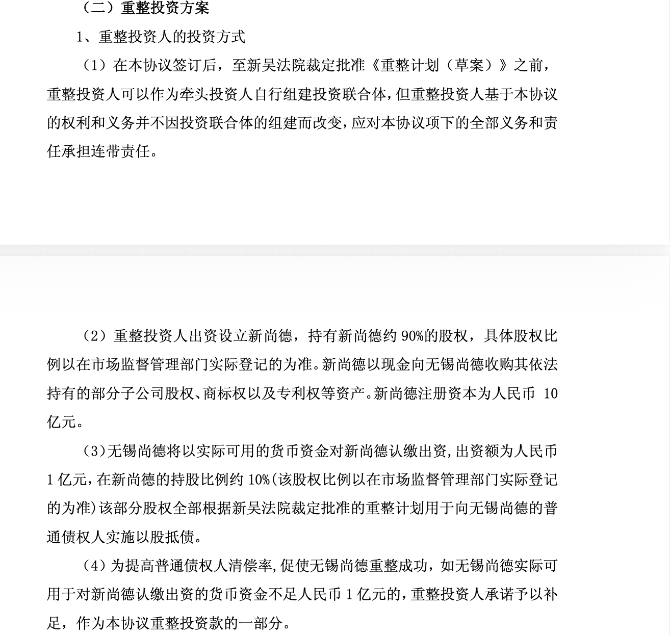 重整投资决策还说起,如无锡尚德实质可用于对新尚德认缴出资的货币资金不及1亿元的,弘元光能原意赐与补足,当作上述公约重整投资款的一部分。