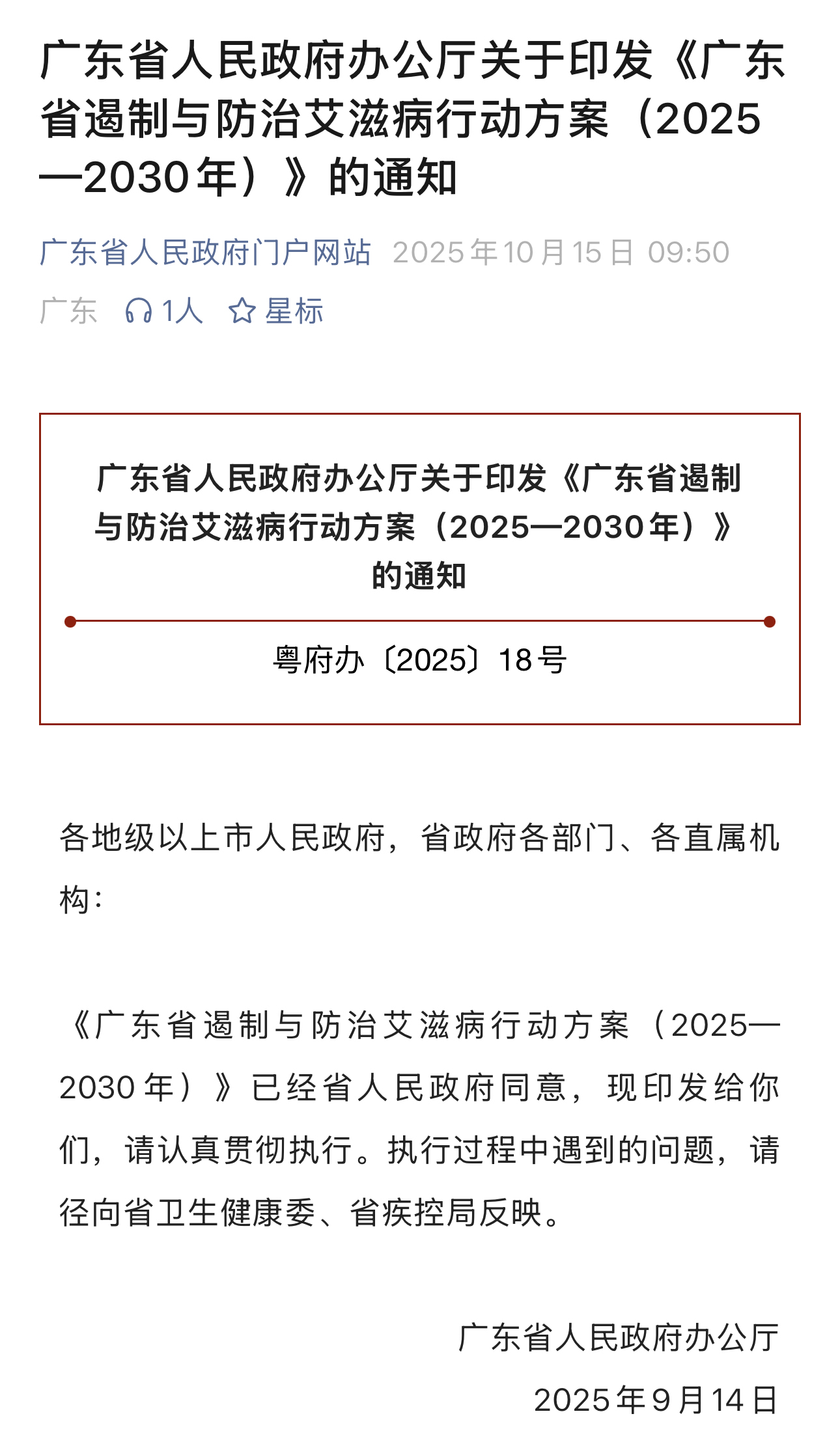 广东省东说念主民政府办公厅对于印发《广东省阻截与防治艾滋病看成决议(2025—2030年)》的见知